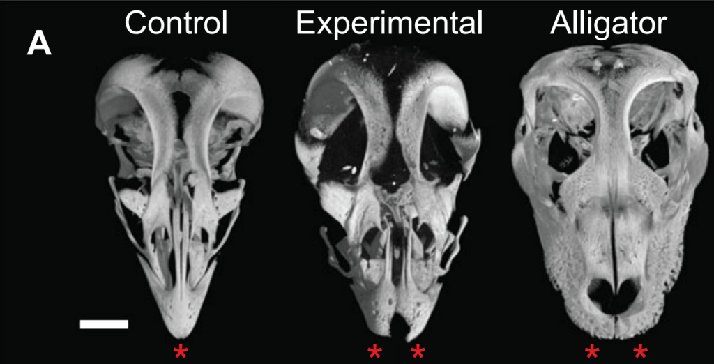 1.เปลี่ยนจะงอยปาก เป็นปากกระบอกแบบไดโนเสาร์: งานวิจัยจากมหาวิทยาลัย Yale และ Harvard นำโดย Bhart-Anjan Bhullar และ Arhat Abzhanov (2015) ค้นพบว่าการใช้สารยับยั้งโปรตีน FGF8 และ Wnt ในตัวอ่อนไก่ สามารถขัดขวางการหลอมรวมของกระดูกจะงอยปาก ทำให้ไก่พัฒนาโครงสร้างใบหน้าที่โค้งมนและแยกออกจากกัน คล้ายกับปากของไดโนเสาร์และจระเข้