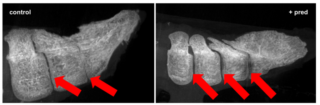– Rashid & Horner (2023): พบว่าหางนกหดสั้นเพราะ “การอักเสบ” จึงใช้ยาแก้แพ้ (Prednisolone) ระงับการอักเสบในตัวอ่อน ทำให้กระดูกหางยืดยาวออกได้สำเร็จ,,